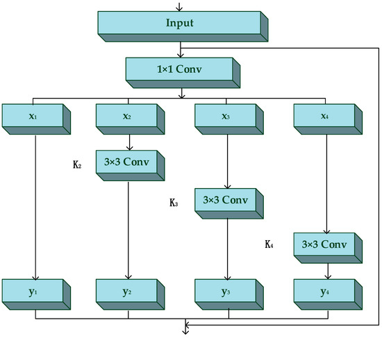 In the ‘Res2 unit’, we divide the input feature map into N sub-features (N = 4 in this paper) on average after the 1 × 1 convolutional layer. Each sub-feature is represented as . Each is in the same size, but it only contains number of channels compared with the input feature map [45]. represents the 3 × 3 convolutional layer. We represent as the output of . So, is represented as: