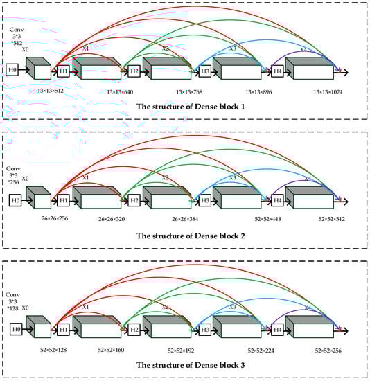The structure of YOLO-V3 in Figure 1 shows that there are six convolutional layers in each detecting layer. In order to avoid gradient fading, we introduce the concept of densely connected networks (DenseNet).