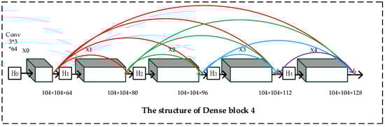 As shown in Figure 6, represents the convolutional layer. – represent the transport layers: Conv (1 × 1 × M) − BN − ReLU − Conv (3 × 3 × 2M) − BN − ReLU. The increments of the feature maps for each layer of ‘Dense block 1’ to ‘Dense block 4’ are 128, 64, 32, and 16, respectively. Compared with the convolution layer, the proposed ‘Dense block’ can alleviate the gradient fading while improving the depth of the network. At the same time, the parameters of the network are greatly reduced.