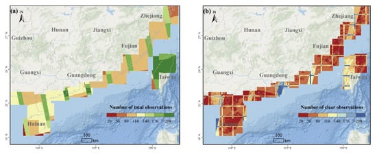 The study area and Sentinel-1/2 data used in this study: (a) the spatial distribution of total observation numbers for Sentinel-1 data covering the study area; (b) the spatial distribution of clear observation numbers for Sentinel-2 data covering the study area.