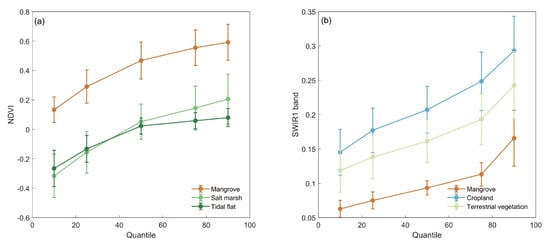 Previous studies have proven that the spectral/backscatter-temporal variability, generated by using remotely-sensed time-series data, could be used to effectively separate mangroves from other land cover types (e.g., salt marsh, tidal flats, cropland, and terrestrial vegetation) [27]. Here, we adopted five quantiles (10%, 25%, 50%, 75%, and 90%) of time-series imagery to quantitatively delineate the temporal profiles of spectral and backscatter signatures. The quantiles were calculated as follows: (1) combining all images during 2013 and 2018 into a multi-dimensional array; (2) for the pixels of each band, sorting all clear values from 2013 to 2018 and extracting quantiles requested. By employing the above five quantiles, it can be seen that mangroves show a remarkable difference from other land cover types. As shown in Figure 2, the quantile values of NDVI for mangroves are much higher than those for salt marsh and tidal flats, while the quantile values of the SWIR1 band for mangroves are much lower than those for cropland and terrestrial vegetation. Additionally, the Student’s t-test result also showed that the differences between the quantile values for mangroves and those for other land cover types are significant (significance level = 0.05).
