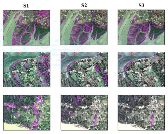 Subsets of classification results derived from S1, S2, and S3. The purple color represents the mangrove extraction results. S1 represents Scenario 1 using Sentinel-1 SAR imagery, S2 represents Scenario 2 using Sentinel-2 imagery, and S3 represents Scenario 3 using both Sentine-1 and Sentinel-2 data.