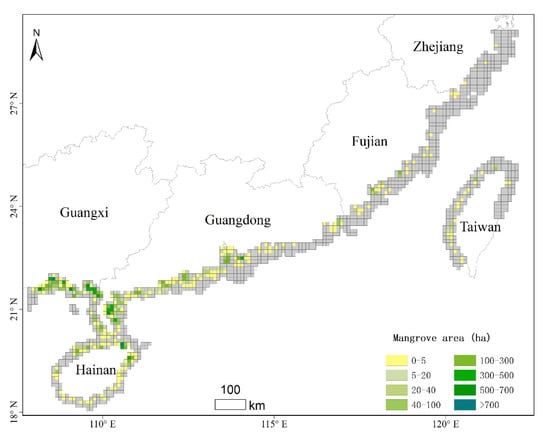 We applied the 10-m mangrove map derived by combining Sentinel-1/2 data to estimate the area and spatial distribution of mangroves in China circa 2015. In total, the mangrove forest area of China in 2015 was about 20003 ha. These mangroves are mainly distributed in the coastal zones of Guangxi (7000 ha), Guangdong (7786 ha), and Hainan (3927 ha) Province, which accounts for nearly 93.6% of the total mangrove area in China. The remaining mangroves in China are scattered in Hong Kong, Macao, Fujian, Zhejiang, and Taiwan. The spatial distribution of the above mangroves is shown in Figure 5 by aggregating mangrove areas to a common unit of 0.1°.