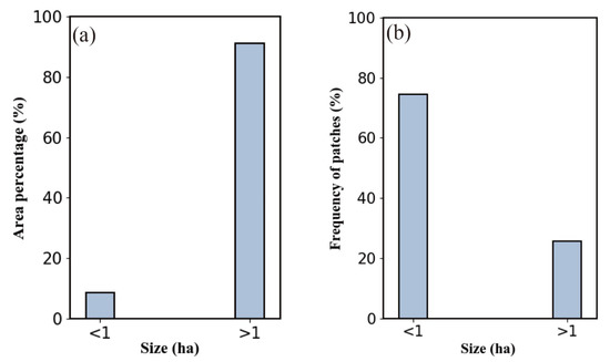 (a) The area percentage of mangrove patches with different size; (b) the frequency of mangrove patches with different size.