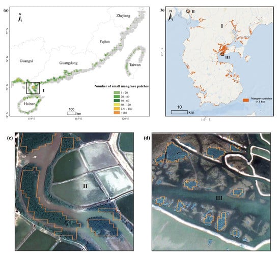 Here, we defined the size of small mangrove patches, which are heterogeneous and disconnected with others, as being smaller than the minimum discriminating area (1 ha) of Landsat imagery. In general, the total area of small mangrove patches is 1741 ha, accounting for 8.7% of all the mangrove forests in China (Figure 6a), and the number (5646) of these small patches occupied a large percentage (74.5%) of total number of patches in China (Figure 6b). The spatial distribution of the above mangrove patches smaller than 1 ha is shown in Figure 7a by aggregating the number of these patches to a common unit of 0.1°. We found that Guangdong province, especially Zhanjiang region (Figure 7b), has a large number of small mangrove patches, and our 10-m map accurately identified them (Figure 7c,d).
