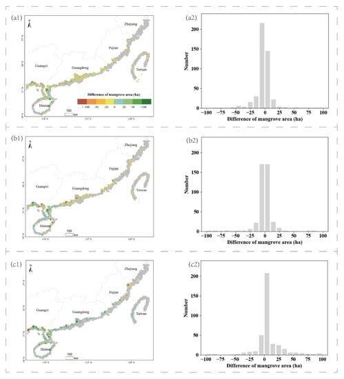 A substantial disagreement between the 10-m map and existing 30-m products was observed (Figure 8). For MFM_2015 (Figure 8a1,a2), the area difference values for 60.1% of the grids are negative. The number of grids whose area difference values are between −25 ha and 0 ha is the highest, and these grids are located over all the coastal zones with mangroves in China. Grids with positive area difference values, most of which are concentrated in the range of 0 ha and 25 ha, mainly occur in Guangxi, Hainan, and a few regions of Guangdong, such as the Zhanjiang region. For MFP_2015 (Figure 8b1,b2), the percentage of grids whose area difference values are larger than 0 ha (49.3%) is similar with those that are smaller than 0 ha (50.7%). The grids, whose area difference values are positive, are mainly distributed in the southwest coastal zones of China, including Guangxi, Hainan, and southwest of Guangdong, while these with negative values are located in the northeast coast of China, including Fujian, Zhejiang, Hong Kong, Macao, Taiwan, and northeast of Guangdong. For GMW_2016 (Figure 8c1,c2), the grids whose area difference values are larger than 0 ha are dominant (77.6%). The area difference values for most grids are between 0 ha and 25 ha and these grids occupy most regions with mangroves in China.
