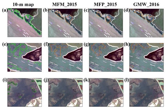A comparison of mangrove extraction results derived from our 10-m map and 30-m products in the Zhanjiang region, Guangdong province, where mangrove area differences for all 30-m products are larger than 100 ha. The green and orange color represents the boundary of the 10-m and 30-m mangrove map. (a–d) are comparison results for a subset dominated by mangroves in narrow strips; (e–h) are comparison results for a subset dominated by sparse mangroves; (i–l) are comparison results for a subset dominated by mangroves with small patches.