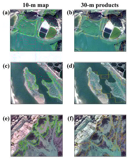 In addition, we also found that in the east coast of Zhanjiang, Guangdong Province, the area difference values for all the above 30-m products are larger than 100 ha. We compared the mangrove extraction results of the 10-m map with 30-m products (Figure 9). The comparison results show that in the Zhanjiang region, a lot of small mangrove patches (<1 ha) were not identified in any 30-m products, but were extracted in the 10-m map, indicating the necessity for generating a mangrove extent product with 10-m resolution. Furthermore, for all 30-m products, there also exists a few grids whose area difference values are smaller than −100 ha. The comparison results for subsets whose area difference values are smaller than −100 ha are shown in Figure 10. The 30-m products misclassified narrow rivers (Figure 10b,d) and salt marshes (Figure 10f) as mangroves, but the 10-m map accurately delineated the mangrove extent (Figure 10a,c,e).