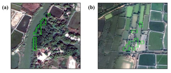 Misclassified pixels of our 10-m map at the edge of rivers (a) and ponds (b).