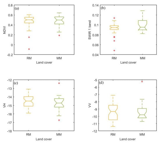 Boxplots of (a) NDVI, (b) SWIR 1, (c) VH, and (d) VV for mangroves (RM) and misclassified mangroves (MM).