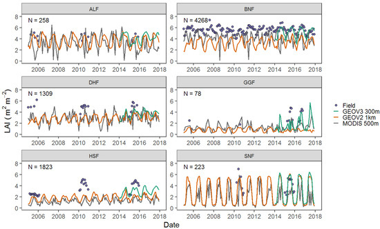 Time series of the LAI for the field, GEOV3 300 m, GEOV2 1 km, and the MODIS 500 m for different sites. The timespan of the LAI time series is from 2005 to 2017. Each field data point represented the mean value of the measurements from the sample subplots in each month. “N” denoted the number of total sample measurements for each site, including the repeat measurements in each month at each subplot.