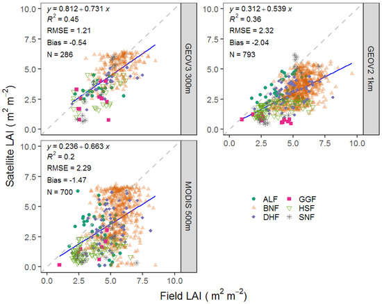 The performance of three EO LAI products was evaluated at six forests across southern China. GEOV3 300 m LAI showed the best fit (R2 = 0.45) and the smallest bias (bias = −0.54) (Figure 3) and the most similar LAI time series seasonal dynamic variation (phase and amplitude) compared with in situ LAI measurements (Figure 5). For the GEOV2 1 km LAI product, its performance had larger bias (Figure 3) and seasonality but similar phases of the LAI time series with the in situ observations compared with GEOV3 300 m LAI products (Figure 3 and Figure 5).