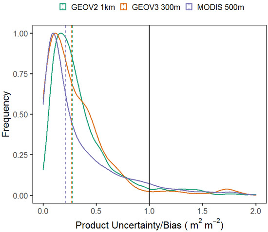 Distribution of the ratio of EO uncertainty estimates to bias, based on a comparison against in situ LAI measurements. Dashed lines represent the median values and the color represents different EO products. The vertical black line is the reference line where the ratio is equal to 1. A ratio larger than 1 indicates the uncertainty estimate is larger than the bias and is therefore considered robust.