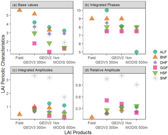 The metaCycle analysis showed that a statistically significant period of 12 months (p < 0.05) is present in the monthly field LAI time series at BNF and in all monthly satellite LAI time series at all sites, except for MODIS 500 m LAI, which showed no significant 12-month periodic characteristics at BNF. Overall, LAI retrieved from GEOV3 300 m showed very close values of the base, phase, amplitude and relative amplitude with the field LAI at BNF (Figure 5). LAI retrieved from GEOV2 1km showed a lower base and amplitude, similar phase, but larger relative amplitude compared with GEOV3 300 m LAI for most sites and the field at BNF (Figure 5). LAI retrieved from MODIS 500 m product showed the lower base values, but had a high variation of phases with one underestimated phase for the forest at ALF compared with the other two LAI products (Figure 5b). The relative amplitude of LAI retrieved from MODIS 500 m is lower for the forest at GGF and SNF, but higher at HSF compared with the other two LAI products (Figure 5c).