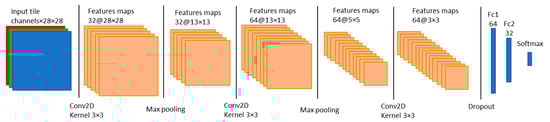 The size of the dataset to train a model is of a crucial importance. Indeed, a neural network needs a lot of examples to “learn” the characteristic features of the object and limit overfitting. Different ways are often used to “artificially” increase the amount of data such as cropping, rotating and flipping [45]. In our study, flipped tiles were used (up and down, left, and right) and 180° rotated tiles to multiply by 4 our original dataset. No cropping was done as we thought that tiles of 28 × 28 pixels were already the lower limit.