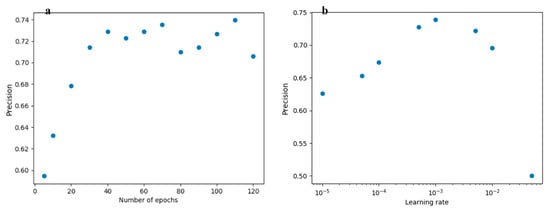 Variability in the precision of the model using different configurations. (a) When the trained model is applied on the test dataset, one can see that there is no significant improvement in the precision after ~30 to 40 epochs. (b) The same is done while varying the learning rate values. The best results are obtained between 10−4 and 1.2−3.