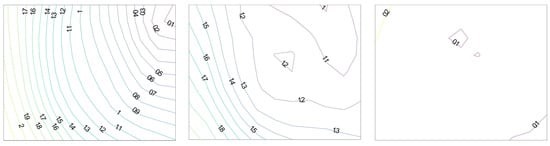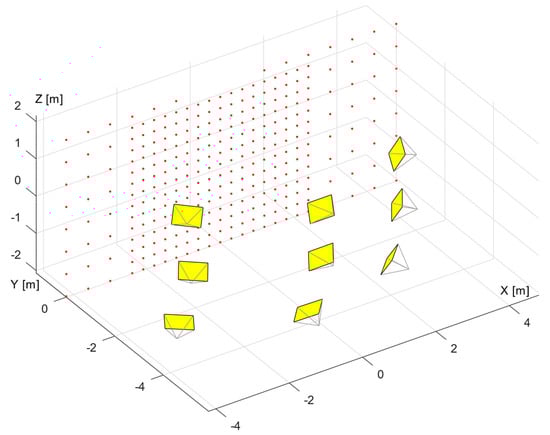 - is the vector representing the orientation of I images, where each vertical vector is composed of Euler angles and forms the rotation matrix . The z-x-z (α-ν-κ) rotation sequence [27] was used as it properly conditions bundles with an inclination of cameras calling in −45° to + 45° range.