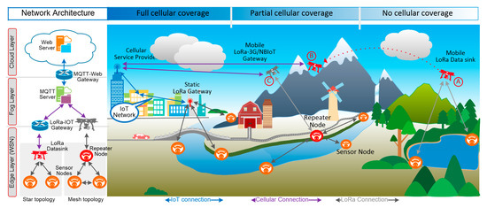 A traditional WSN connects the sensor nodes (SNs) in a clustered network [1] with static network topologies using multiple base stations (BSs) or a data sink (DS), and transfers the sensor data using multiple repeater nodes [2] to increase the monitoring coverage area. This type of WSN is used mainly for densely populated sensor networks and is not suitable for wide-area remote monitoring (WARM) applications, where both temporal and spatial data is acquired in real time. The clustering procedure in WSNs uses various optimization methods [3] to improve the energy requirement and WSN lifetime. This clustering process may not be suitable for the battery-powered and resource-constraint nodes that are used in remote locations with less accessibility. A WSN also uses multiple special nodes as a hop that retransmits the sensor data to the BS in order to increase the WSN coverage, and also to distribute the energy load over the SNs. In doing so, a WSN implements complex routing algorithms which generate extra processing loads for the repeater nodes and the SNs, and hence, energy consumption is increased.