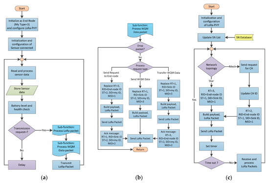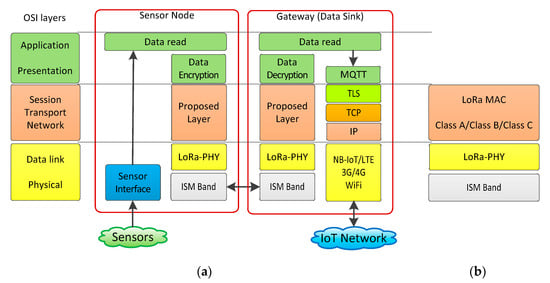Table 2 summarizes the basic features of Low-Power Wireless Area Network (LPWAN) technologies [50,51,52], such as LoRa, Sigfox, Dash7, Ingenu, ZigBee, 6LoWPAN, Bluetooth, and Wi-Fi. Although NB-IoT is a cellular technology, it is included in Table 2 as it is designed for IoT connectivity for SNs. Among these LPWAN technologies, LoRa was chosen for its low-power, long-range connectivity, and performance evaluation in several recent works [51]. Table 2 shows that LoRa falls in the third position in terms of range and the second position in terms of data-rate. However, because of the requirement of the cellular infrastructure and the related high operational cost of NB-IoT, LoRa can be chosen for the WSN connectivity for WARM as a low-cost option. Unlike LoRaWAN, LoRa-PHY can be used to achieve more flexibility to configure the WSN topology as star, tree, or mesh by implementing a custom network layer on it. Moreover, LoRaWAN supports three types (A, B, and C) [53] of channel acquisition. In contrast, custom channel acquisition can be achieved using the proposed layer on top of LoRa-PHY; Figure 3a shows the protocol stack used with LoRa-PHY in this paper relating with the OSI layers. Figure 3b shows the LoRa-WAN stack compared with the proposed stack. The basic three layers are shown in this stack, which are the LoRa-PHY, proposed, and application layers. The proposed layer corresponds to the network, transport, and session layers of the OSI (Open Systems Interconnection) reference model. In the network layer, it uses the physical IDs of the SNs and the DS to select the logical route. In the session and transport layers, it forms the LoRa payload packet for the sensor data along with some headers to maintain the connectivity for the logical route. To keep the protocol lightweight for the SNs all these OSI layers are implemented together as a single function, as described in the following subsection.
