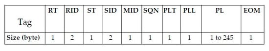 This proposed protocol is a master-initiated communication protocol to keep better synchronization in the WSN. Figure 4 shows the message format without the LoRa packet header. A single packet can be 12 to 256 bytes. Packet transmitter and receiver types (ST, RT) can be any of the DS, RN, or SN. Table 3 describes all the fields of the WARM-packet with example values. ST and RT facilitate the SN and DS to configure the WSN dynamically as a star or tree topology according to the WARM requirement. SQN keeps track of the link between the data request to data received in order to cope with the multi-node transmission, mainly in a tree network. PLT and EOM facilitate a multi-packet data transfer for a payload larger than 245 bytes. A multi-packet data transfer can be implemented for offline data acquisition by the mobile DS or for sensor data acquisition at a very high rate, such as multiple samples for every transfer interval. The payload consists of the sensor data, measured parameter unit, and timestamp. It also includes the node ID to implement the message transfer by the repeater node.