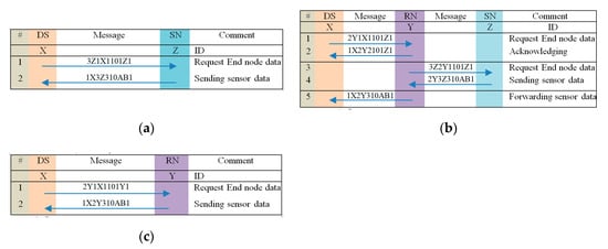 The LDAP has three phases: initialization, configuration, and routing. In the initialization phase, the SN configures itself automatically with the sensors connected. The parameters need to be acquired, including the interval for data acquisition and the node’s initial energy state. This configuration can also be done at the beginning of the WSN deployment or at any time required by using the configuration message (MID = 5). For the mobility of at DS, both configuration and routing phases are performed simultaneously in the data transfer request message (MID = 1). The WARM configuration message (MID = 4) is also implemented for a fixed topology while using a static DS. The acknowledgment message (MID = 2) is implemented for the synchronization of the data transmission message (MID = 3) to enable sensor data transmission from the edge SN to the DS or RN, and from the RN to the DS. Figure 5a shows the direct DS to SN data transfer protocol. Figure 5b shows the configuration and data transmission from the DS to SN through the RN, and Figure 5c shows the data transfer protocol between the SN and RN. Every data transfer from the SN to DS through the RN ensures a single-hop data transmission to reduce data transfer energy consumption. The selection of a different SN as the RN for every round of non-direct data transfer helps to maintain the energy balance in the WSN, thus keeping the WSN homogeneous, which is very important for dynamic network topology. This dynamic RN selection can be performed by proper DS travel route planning, using an offline optimization algorithm.