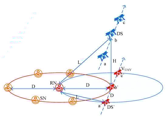 The proposed LDAP can be implemented using any type of ground or over-the-ground vehicle depending on the WARM applications. However, most of the WARM applications may require remote connectivity where the SNs are difficult to access using ground vehicles. Therefore, for the WARM case, an UAV-mounted DS is considered. Figure 7 shows an UAV-mounted DS, which is moving from its initial position, a, to b and then to c, at a ground speed of VUAV, at an altitude of H, and with the LoRa link distance from the RN represented by L. The projected position of the DS is shown as DS’ at different times (at a’, b’, and c’). The projected distance between the RN and the DS’ is D, which is considered equal to H for optimized altitude vs. the wireless link coverage condition, so that D = H = 0.7 L. An UAV-mounted DS needs to perform two tasks; link establishment and data transfer. To keep the proposed LDAP lightweight, these two tasks are designed to meet the UAV speed and also the LoRa TOA. According to the experimental setup used for the WQM case, we calculated a data transfer time through the repeater node (TAQRN) as 856 ms for the maximum sensor data size of 245 bytes. We can calculate the number of SNs data messages to be transferred using a low to medium height UAV, such as the Zephyr 7 [56], with the following conditions: