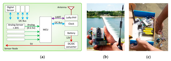 A low-power SN is designed to implement and test the proposed LDAP using an 8-bit microcontroller (MCU), namely the ATMega328, with only 32 kB of ROM (Read Only Memory), 4 kB of RAM (Random Access Memory), and running at 16 MHz. Figure 8a shows the hardware block diagram of the SN with LoRa and sensor connections. With the SX1276 LoRa module at 915 MHz, the MCU is capable of interfacing four analog sensors and four digital sensors simultaneously through the built-in ADC (Analog to Digital Converter) and I2C (Inter Integrated Circuit) interface, respectively. The MCU used in the SN is powered by a 12 V to 5 V voltage converters, and the sensors connected with it also need to operate at 5 V. The total SN is powered by three 18,650 Li-Ion batteries, each of 6000 mAH, providing 10.8 V to 12 V, which can also be replaced by a 12 V lead-acid battery with a 12 V solar panel for external charging for lengthy remote operations. Figure 8b,c show two SNs connected with a LoRa wireless module, battery, and the different types of sensors used in the field trial. The DS and LoRa-IoT gateway are implemented using a Raspberry-Pi with LoRa, Wi-Fi, and a dedicated LTE-Wi-Fi access point.
