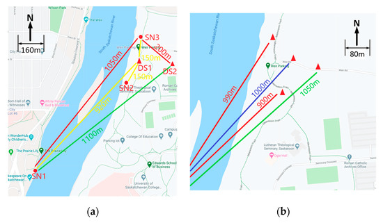 Google Map view of (a) WQM field trial setup of Sensor Nodes SN1, SN2, SN3, and Data Sinks DS1, DS2, DS3; (b) different positions of the mobile data sinks.