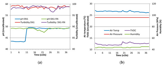 We evaluated the functional performance of the SNs in a fully configured IoT network. We used seven SNs to collect data from different types of sensors and send them to the IoT server through two data sinks. The system was also configured to form the network in two different ways: star networks (SN to DS direct link) and tree networks with the DS using any one SN as the RN, where one SN does not have direct wireless connectivity with the DS. Data from a SN were acquired at three-second intervals, which is a very high rate compared to 15-min intervals; thus, more than 800 packets were collected during the two-day experiment. Figure 10a shows the pH and turbidity data taken from the South Saskatchewan River gathered directly from two different SNs to the DS and via the RN, respectively. Figure 10b shows the air-quality data received from the temperature, pressure, uncalibrated TVOC (total volatile organic compound measure), and humidity sensor on the river bank. Data delivery success rate between the SN and DS was 100%, and through the RN was 99%.