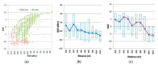 Network performance was measured in terms of RSSI (Received Signal Strength Indicator), SNR (Signal to Noise Ratio), and data loss from the SN received by the DS. For the WARM application in some remote locations using a mobile DS radio signal, the quality depends on various environmental parameters along with the distance between the SN and the DS. With varying distances, data loss is the primary performance indicator, and when measured was found to depend on both the RSSI and SNR. Figure 11a shows that data loss becomes significant when the RSSI goes below −95 dBm with the SNR below 0. Increasing data loss was observed with a decrease of the SNR and RSSI, mainly above a 1000 m distance and without a line of sight. Figure 11b, c show the relationship between the RSSI and SNR with the distance between the SN and DS, respectively; the line curve is for the median values, and the box graphs show the ranges of RSSI and SNR values at different distances. These results can also be used by the mobile DS to improve the data delivery rate by using a RN or by changing the transmit power or the travel path.
