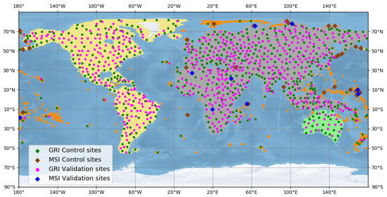 Control and Validation sites used in the block triangulation procedure. The green and magenta circles represent the Global Reference Image (GRI) control and validation tiles, respectively. The brown and blue diamonds represent the Multispectral Imager (MSI) control and validation tiles, respectively.