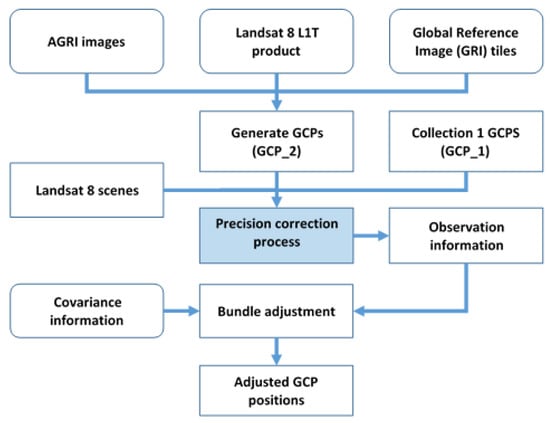 Schematic flow of how GRI- and Landsat-8-derived Ground Control Points (GCPs) are used in the bundle adjustment techniques. The triangulation-based bundle adjustment provides correction estimates for the spacecraft information (ephemeris, velocity, attitude, attitude rate) along with position updates for the GCPs, but we are interested only in the updates to the GCP positions.