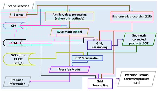 A simplified version of the Landsat process flow for generating terrain-corrected products. The shaded (transparent blue) portion shows the algorithm used in the precision correction process. Each input, output, and process shape is color-coded, and the arrows from them are also color-coded for ease of understanding. For example, a Calibration Parameter File (CPF) stores the calibration parameters and, therefore, is shown using the corresponding flowchart shape with a blue border. The CPF is used in ancillary data processing, systematic model generation, and in the radiometric processing, and is therefore shown in blue arrows.