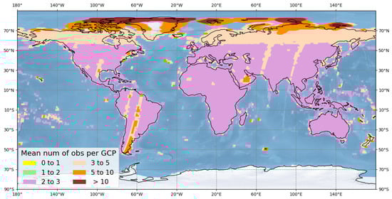Average number of observations per GCP for each World Reference System (WRS)-2 path/row used in the bundle adjustment procedure. The large overlap in the northern latitudes generates a higher number of observations per GCP.
