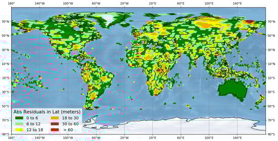 Mean residuals of the GCPs in the latitude direction for each of the WRS-2 paths/rows, computed from the block triangulation solution.