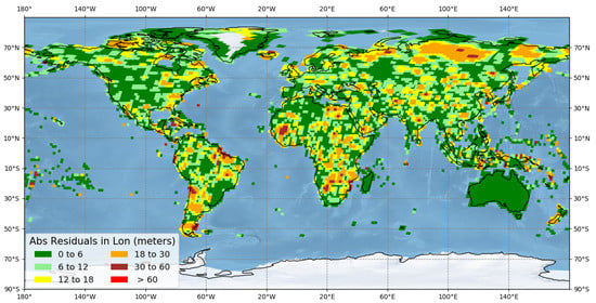 Mean residuals of the GCPs in the longitude direction for each of the WRS-2 paths/rows, computed from the block triangulation solution.