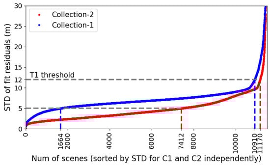 Comparison of the STD from the precision model fit residuals between Collection-1 and Collection-2 processing of the test scenes. The red and blue lines indicate the STD for the Collection-2 and Collection-1 products, respectively. The Collection-2 products show significantly lower STDs than Collection-1 products.
