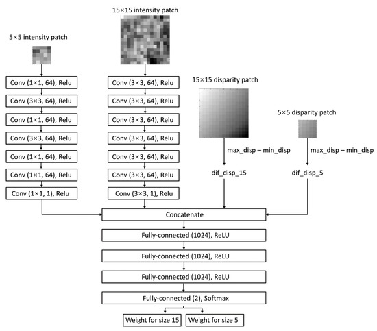 The data term E d a t a ( L ) is a function of matching window sizes based on variations of image intensities and disparities. In general, it calculates, for every pixel, the cost of selecting small or large windows, which is an actually negative correlation to the window weights, and then sums these window selection costs across the entire image as the data term to this energy function, as shown in Equation (2). In our method, we design a CNN-based network for estimating the windows weights, which will be described in Section 3.2.1.