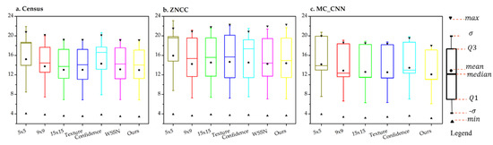 Table 3 lists the statistics of the bad pixel percentage for the five image pairs where, for each result, the statistical metrics are computed for (1) the 5 × 5 pixels window; (2) the 9 × 9 pixels window; (3) the 15 × 15 pixels window; (4) texture-based window selection [25]; (5) confidence-based window selection [31]; (6) window size selection network (WSSN) [32]; and (7) our proposed method. It can be seen from Table 3 for most of the seven matching window selection/fusion methods with the three matching cost metrics, 5 × 5 pixels matching window achieved the worst matching accuracies. Since satellite images had relatively low GSD, when compared with the indoor and the aerial dataset, the 5 × 5 pixels matching window is too small to contain enough image information, especially in some weak-textured regions (e.g., roads, roofs), thus resulting in high matching uncertainties (see the higher σ , ranges, and confidence intervals in Table 3). The 15 × 15 pixels matching window contained more image information in weak-textured regions, thus resulting in higher matching accuracies than the 5 × 5 pixels matching window (smaller means, σ , ranges, and confidence interval values in Table 3). The 9 × 9 pixels matching window is a trade-off between the 5 × 5 and 15 × 15 pixels matching windows. It is able to achieve similar matching accuracies to 15 × 15 pixels matching window in satellite dataset but less matching cost computation complexities. The texture-based window selection method achieved high matching accuracies on Census and MC-CNN-fst matching cost metrics, while low matching accuracies in ZNCC matching cost metrics, which shows the instability of such a method among different matching cost metrics. The confidence-based window selection method is only better than the 5 × 5 pixels matching window but worse than all other window selection strategies, which shows that the confidence-based method is unable to predict appropriate windows in satellite images, even though it considered both the texture and the disparity information. The Window size selection network (WSSN) method performs slightly better than other window selection methods in ZNCC matching cost metric. Finally, our proposed method achieved the best or comparable matching accuracies among all matching cost metrics. It shows that our proposed method can estimate appropriate window weights for the fusion of the matching results of each pixel in satellite images and achieve stable matching accuracies on different matching cost metrics. For a better understanding and comparison across different matching cost metrics of the distribution of mismatch-3 metric from each pair on the satellite dataset, we drew an improved boxplot based on eight numbers (minimum, standard deviation ( σ ), first quartile (Q1), median (second quartile, Q2), mean, third quartile (Q3), and maximum, as shown in the legend) in Figure 6. It can be seen from Figure 6 that our method also achieved the optimal interquartile range (IQR) for Census and the MC-CNN-fst matching cost metric, similar to the range and confidence interval shown in Table 3. The box bounds of the IQR is divided by the median. Comparing all the results on the three matching cost metrics, we proposed method achieved the smallest median, as shown in Figure 6.