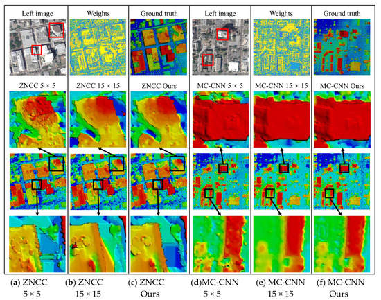 The Vaihingen image pair mainly charactered with gable roofs and trees. The 5 × 5 pixels matching window is able to recover most edges of the buildings. However, it contained some mismatches in weak-textured regions, e.g., the roof and the tree area in Figure 5b. In contrast, the 15 × 15 pixels matching window can recover smooth surfaces in weak-textured regions. However, since the disparity consistency assumption cannot be satisfied in disparity jumps, it produces over-smooth edges (e.g., building boundary and the ridgelines of gable roofs). Our proposed method was capable of estimating higher weights of small windows in edges and higher weights of large windows in weak-textured regions, thus leveraging the advantages of both windows and computing the most accurate matching results.
