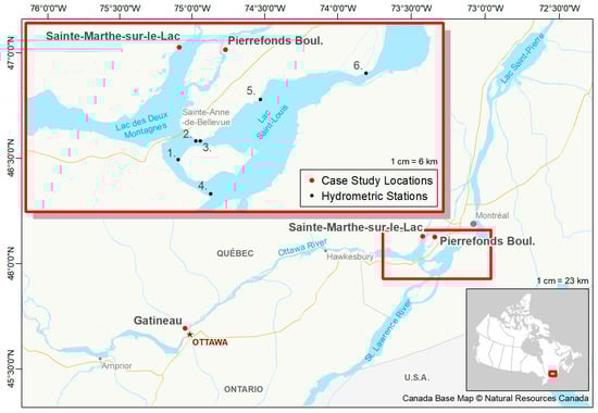 The approximate east-west extent of the region of Central Canada along the Ottawa and St-Lawrence Rivers affected by the 2017 and 2019 flood events, with three urban borough regions of interest used as urban flood mapping case studies shown as red dots. Black dots show hydrometric station locations 1. 02OA107; 2. 02OA013; 3. 02OA033; 4. 02MC005; 5. 02OA039; and 6. 02OA016 referred to in Figure 2.