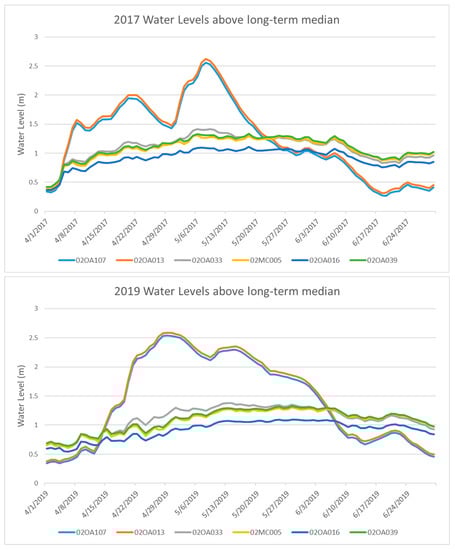 Data from three stations located on the Ottawa River were also downloaded to provide water level data for the region beginning in 2000, 2011, and 2018, and ending in year 2019. Peak water heights greater than 3 m above long-term median levels were reached at hydrometric stations near Gatineau around May 7, 2017 and April 30, 2019.