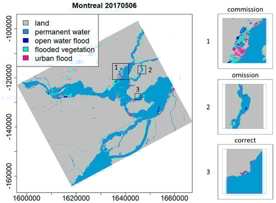 RS2 flood map from May 6, 2017 used to approximate water levels along urban shorelines, with examples of adjacent flood-filled urban areas using Lidar DEM data. On individual dates, examples of known errors of commission, omission, as well as correctly mapped urban flooding according to independent National Aerial Surveillance Program (NASP) and Citizen Geographic Information (CGI) data are shown in boxes 1–3.