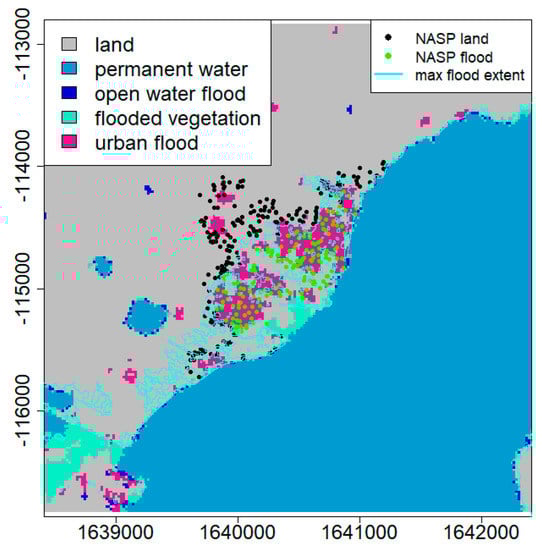 An assessment of the maximum flood extent map was conducted by visually interpreting NASP oblique images and still frames captured by video in the Pontiac region just east of Ottawa/Gatineau. Samples were selected in the flood zone and 150 m beyond according to the maximum flood extent product. The flood zone represented the area mapped as water in the flood product that was not permanent water according to Canada’s National Hydrometric Network base data (NHN) []. A total of 2808 points were established in the flood zone and on land in the adjacent 150 m buffer using a regular grid spacing. Of these points, 1191 were interpretable in the oblique images as either land or flood. An assessment conducted on the final maximum flood extent product against reference points interpreted from NASP images produced an overall accuracy of 95.6% and a kappa statistic of 91.1%, with well-balanced user and producer accuracies suggesting minimal bias in the classification towards either land or flood (Table 2). This product will serve as one of several ‘ground truth’ references in subsequent analyses.
