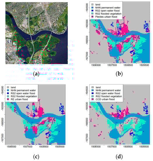 Sainte-Marthe-sur-le-Lac: (a) High-resolution natural colour image from GoogleEarthTM; (b) urban flood extents derived from a PlanetScope NIR image acquired on April 29, 2019; (c) urban flood extents derived from a WorldView-3 image acquired on May 5, 2019; (d) urban flood extent derived from thresholding a CCD image between γpost and γco. Background classification for panels b-d is an EGS RS2 flood map from May 3, 2019.