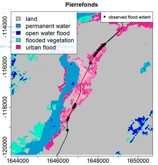 A substantial amount of urban flood mapping research has focused more on risk and less on near real-time mapping for current situational awareness []. Despite advances in recent years, remote-sensing of urban flooding remains a challenge []. Different approaches including the use of high-resolution radar and change detection [] have been developed; however, the relatively small footprint of high-resolution data limits its coverage to an area on the order of a few square kilometers, which is much smaller than the region impacted by the 2017 and 2019 floods. Optical fusion of coarse-resolution MODIS and medium resolution Landsat [] was used to generate flood maps with an accuracy of around 90% following the 2005 flood in New Orleans from Hurricane Katrina. While data fusion combines the advantages of daily revisit from coarse-resolution data with the detail of medium-resolution imagery, fundamental limitations of optical sensors are still present due to cloud cover combined with a lack of detail from moderate resolution sensors to detect street-level flooding. High-resolution optical imagery has been shown to perform well for surface water mapping in Olthof [] and integrated with Digital Terrain Model (DTM) data using machine learning for flood mapping in Lamovec et al. []. Both studies demonstrate the advantages of these data in terms of detail, but limitations persist in urban areas depending on building density and shadow, while clouds continue to restrict their usefulness for near real-time flood mapping. Finer resolution airborne photography and UAV imagery [] acquired below the cloud cover provide the most detail but their limited footprint, barriers due to regulations in Canada, timing, and deployment restrict their usefulness for operational flood mapping.