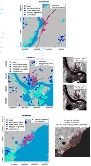 High-resolution optical imagery acquired during near peak-water levels was classified to map the maximum flood extent for 2019. Hydrometric data showed that water levels peaked around the end of April to early May in the Lake of Two Mountains, breaching the dike eastward in Sainte-Marthe-sur-le-Lac on April 27. Flood extents were mapped using PlanetScope’s NIR surface reflectance by applying a dark threshold value to mosaicked tiles representing eight separate regions. The threshold value was selected by inspecting reflectance values of dark water located in the middle of lakes while attempting to minimize commission error with other dark features such as urban shadow and wet fields. Commission error was further reduced by sieving small dark objects not representative of water bodies but more likely of shadow. Once sieved, only larger dark objects remained, representing seeds of water bodies that were subsequently region-grown into areas darker than a brighter multiple of the original threshold value. Individual parameters were modified slightly between regions to obtain an optimal result based on visual inspection. NIR dark threshold values ranged between 800 and 1500 Digital Numbers (DN = surface reflectance × 1000) or 0.8 to 1.5% reflectance, sieve sizes varied from 300 to 500 pixels and region growing thresholds were between 1.6- and 1.9-times original threshold values (e.g., 1280 to 1520 DN for the 800 DN threshold). Some manual editing was performed to generate the final product (Figure 3), mainly by removing fields and other features mapped as water that may have been flooded but were not directly connected to the main channels of interest.
