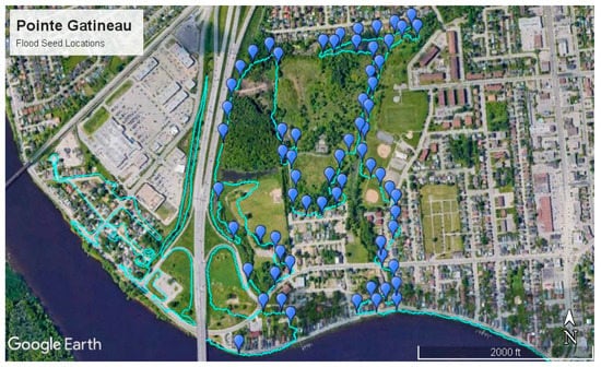 Three neighborhoods where flooding occurred in 2017 or 2019 were considered for simulation, including Pointe-Gatineau that flooded both years, Pierrefonds that experienced significant flooding in 2017, and Sainte-Marthe-sur-le-Lac that flooded in 2019 after the dike breached. A range of possible point observations of the flood perimeter along roads that flooded during these events was used to simulate full flood extents in these neighborhoods. Road sections along 22nd Avenue in Sainte-Marthe-sur-le-Lac, Pierrefonds Boulevard in Pierrefonds, and Rue Saint Louis in Gatineau were considered in each of the three boroughs. Along each road section, one hundred evenly spaced point observations served as seeds for flooding. For each flood perimeter seed point location, the flood-filling algorithm was applied with Lidar DEM data (Figure 10).
