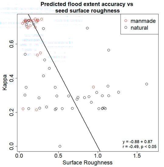 According to the 5 m DEM, water height sampled at 70 points along the flood perimeter to the east of the highway was 44.87 m asl, with a standard deviation of 0.52 m and a range from 42.70 m to 44.87 m, or just over 2 m. Kappa values of simulated flood extents compared to maximum flood extents from each of these 70 seed locations ranged from 0 to 0.746, and were found to be significantly inversely related to seed location surface roughness (r = −0.49, p < 0.05) (Figure 13). In other words, seed locations with higher local topographic variation generated poorer flood simulations than those that were flatter in their immediate vicinity. Most of those locally flatter seed locations that produced better simulations represented manmade features such as roads, sidewalks and grass, while those that produced poorer simulations represented taller vegetation located on the riverbank, in gullies and ditches, or adjacent to creeks. Overall, it appears that taller vegetation is more often located in natural, topographically complex areas, while manmade features tend to be flatter.