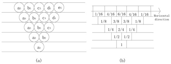 Probability integration, firstly proposed by J. Litwiniszyn [20], is a mining subsidence simulation method based on stochastic medium theory. It considers the movement of particles, such as sand or tiny rock masses, as a random event, which makes the relationship between particles irrelevant. The mining area can be divided into a number of differential units with the assumption that they are mined. The total impact of the complete mining on the rock formation and the surface can be regarded as the integral of the small impact generated during the mining of the differential units. As shown in Figure 1a, when the ball (named ) on the first floor is taken away, one of the balls on the second floor ( and ) will fall, so the probability of falling for each of the two balls is . Then, one of the balls on the third floor will fall, and the falling probabilities for each of the three are , , and , respectively (in Figure 1b).